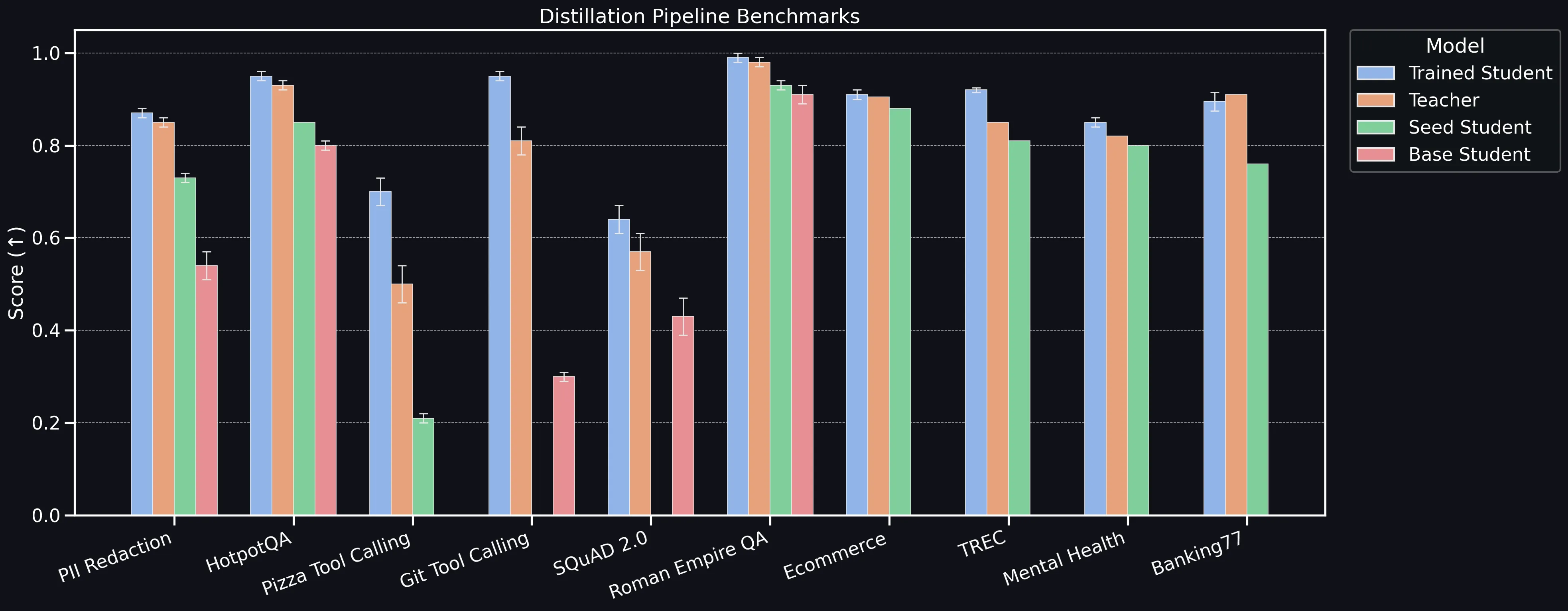 - Trained Student (ours). Student (Llama3 3B) trained on seed + curated synthetic data generated by the teacher. Making sure this strategy scores as close as possible to the teacher is the main goal of our benchmarking.