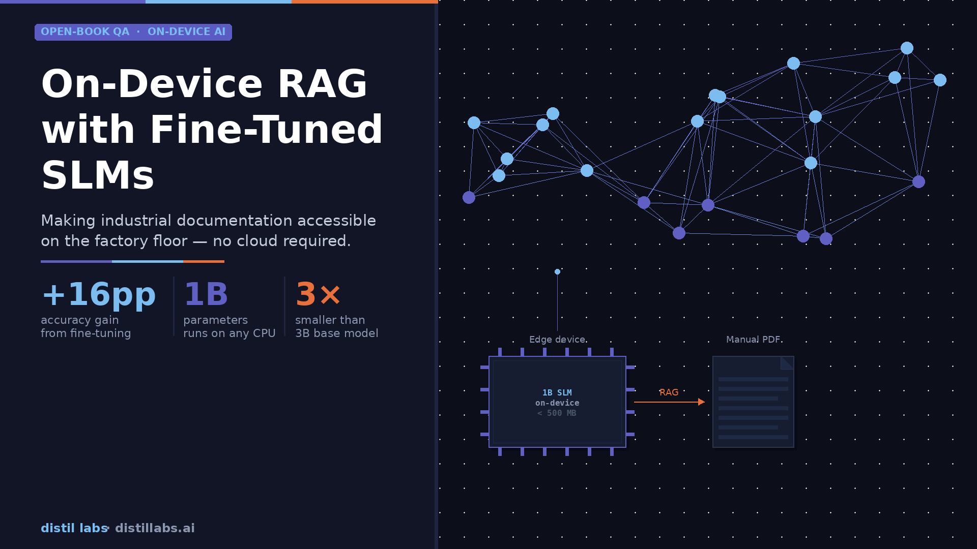 TL;DR: Fine-tuning a 1B parameter model on domain-specific documentation delivers a +16 percentage point accuracy gain — bringing it to parity with a 3B base model, at a fraction of the hardware cost. For OEMs building industrial equipment, this makes on-device RAG viable without expensive AI-optimized silicon.