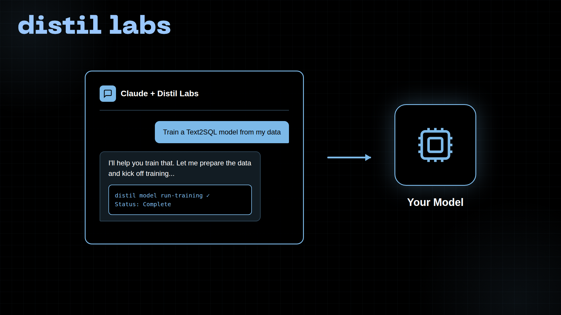 In this post, we will do exactly that and train a Text2SQL model in a single conversation. We'll start with a bunch of unstructured data, use the Distil Labs Claude skill to handle the heavy lifting, and end up with a working model running locally. You can follow this walkthrough along, all the artifacts we used are in the example repo.